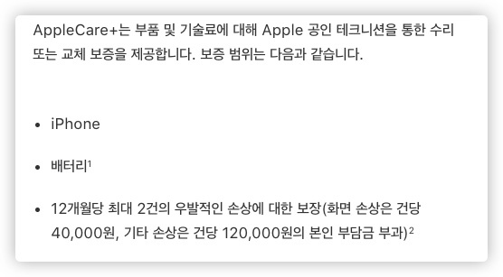 애플케어플러스는, 애플 일반 제한보증 및 애플케어와는 다르게 "우발적인 손상", 즉 국내 제조사 무상수리 조건에도 해당되지 않는 소비자 부주의로 인한 파손이나 고장 등을 상대적으로 저렴한 비용으로 수리 또는 전체 리퍼가 가능한 보증 프로그램입니다.