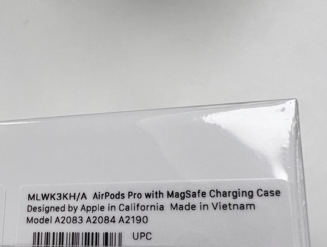 에어팟 프로 맥세이프 호환 버전 패키징입니다. 박스 크기나 패키징은 일반 버전과 동일하며, 측면에 새겨진 Airpods Pro 아래에 magsafe charging case라고 추가로 새겨져 있는 점이 차이가 있습니다. 그 외에 다른 패키징은 동일하며, 하나 눈에 띄는 점이 "모델명"이 달라졌습니다.
