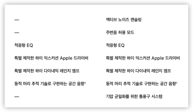 가장 큰 차이로, 에어팟 프로와 에어팟 맥스에서만 지원되던 공간 음향이 에어팟 3세대에서도 지원이 됩니다.