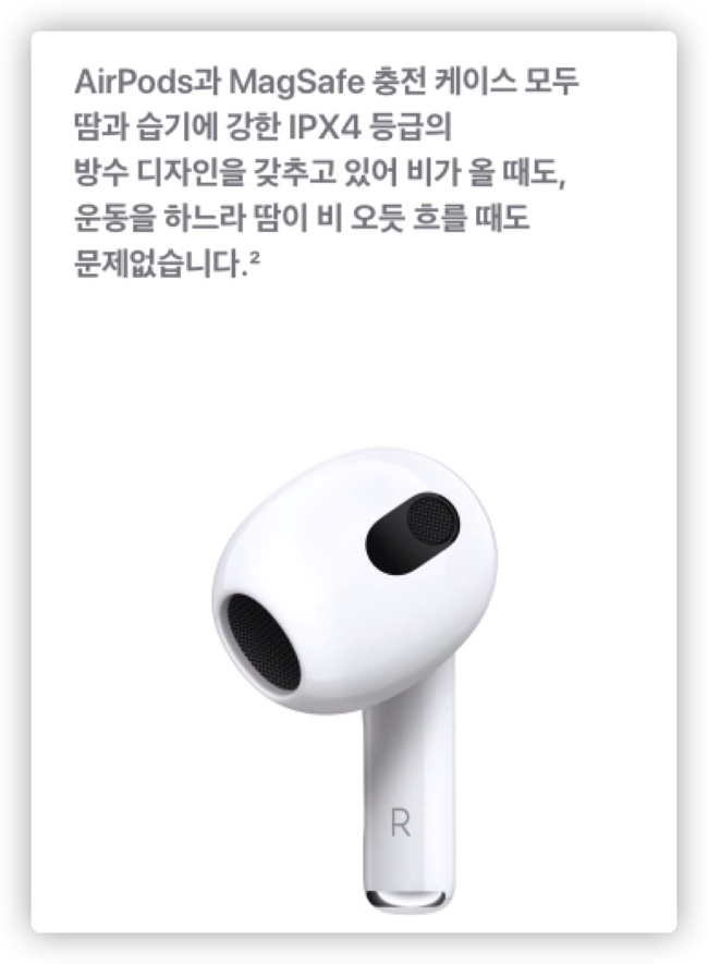 실리콘 팁이 귓 구멍 일부까지 들어가는 커널형 형태의 이어폰을 싫어하시는 분들이라면 고민 없이 에어팟 3세대로 가시면 됩니다.