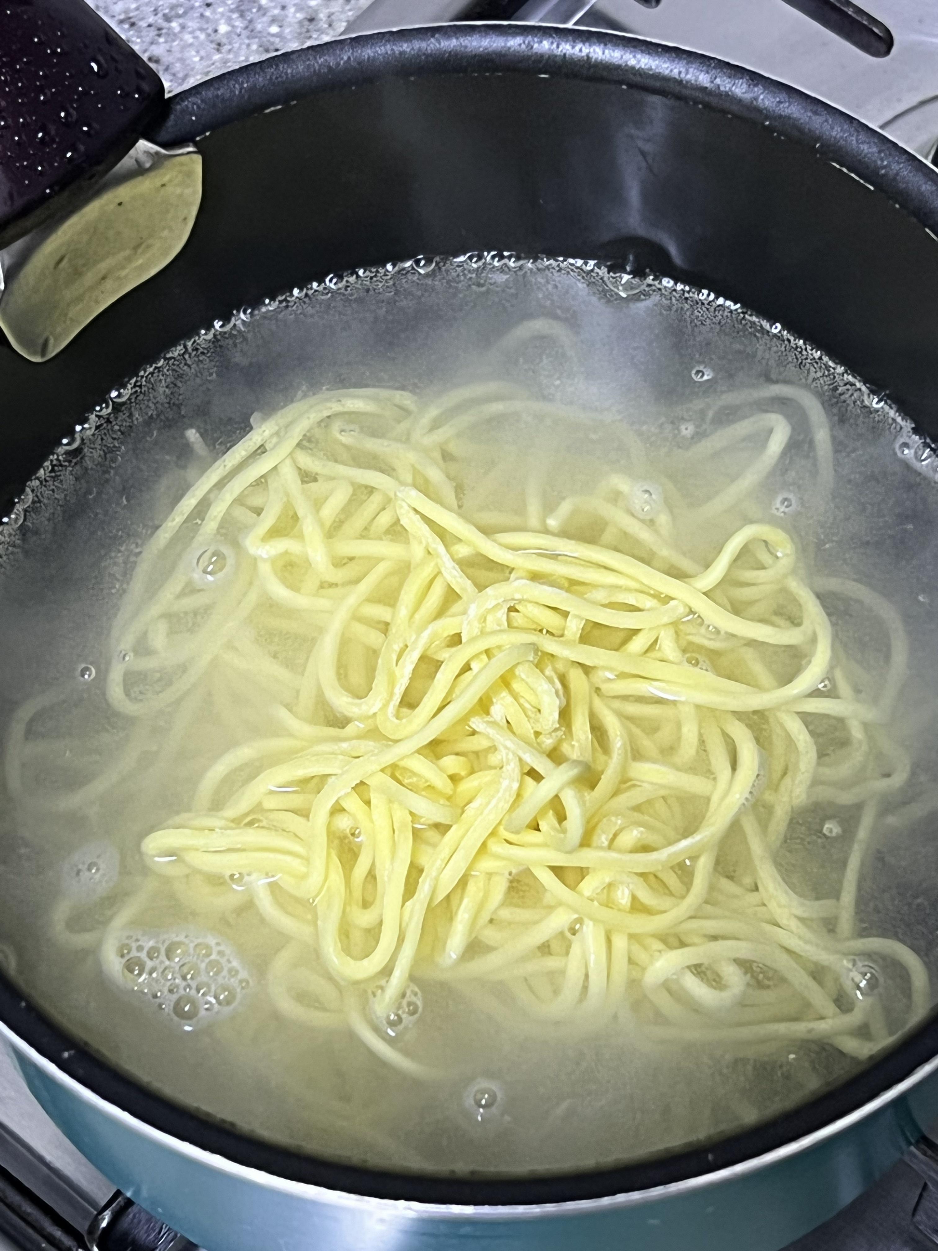 면을 익히고 난 뒤, 체로 면을 건져줍니다. 너무 물이 흥건하면 나중에 짜장 소스를 얹었을 때 퍽퍽할 수 있기 때문에 그냥 체로 건져만 주면 됩니다. 그럼, 이제 오뚜기 유니짜장을 본격적으로 맛보겠습니다.