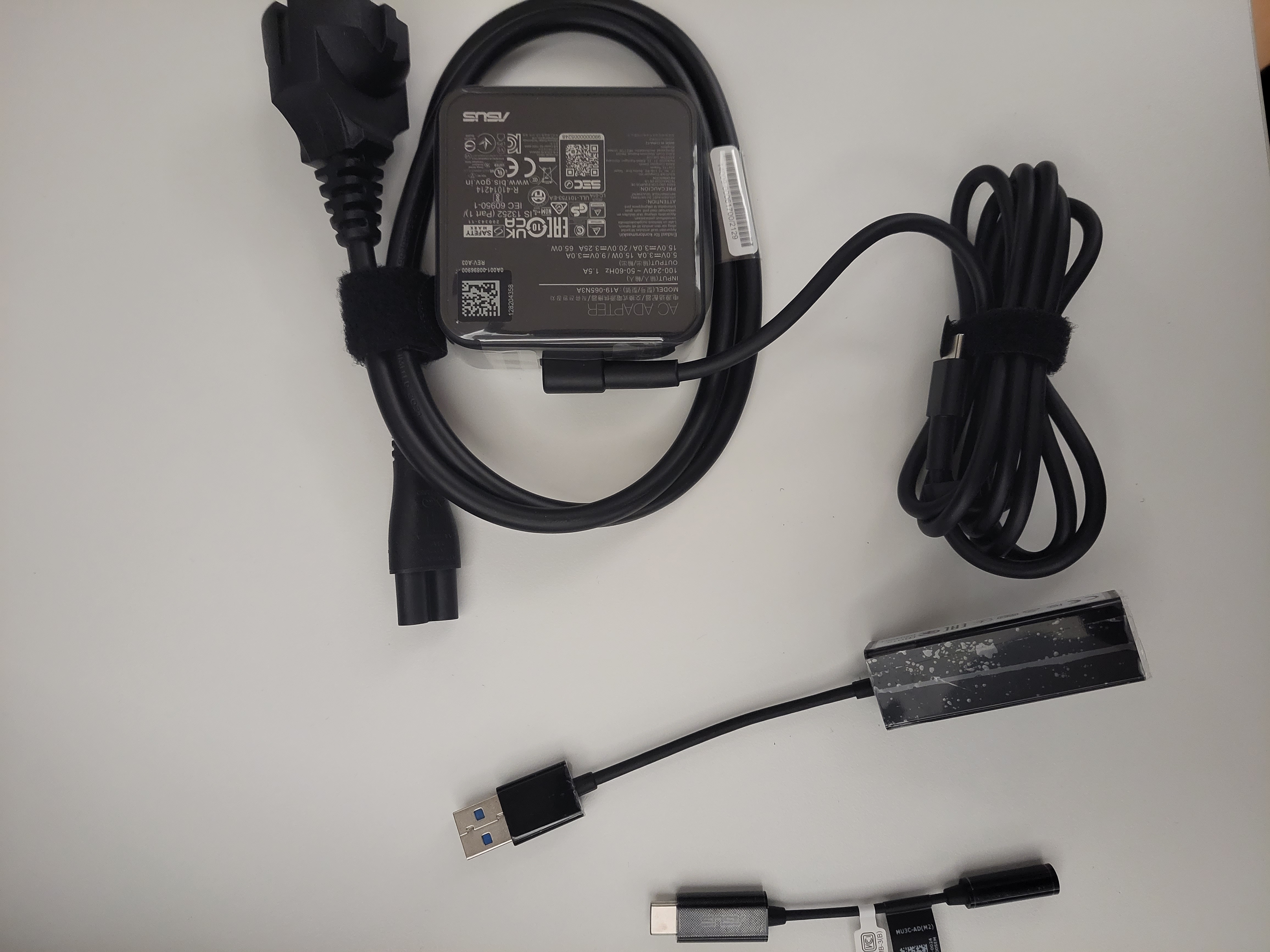 본체 이외의 부속품은 65W의 작은 어댑터, 그리고 USB 타입의 유선 이더넷 연결 젠더, 그리고 3.5mm 이어폰 잭 변환 젠더가 들어 있습니다. 아수스 젠북 UX425 EA-KI117이 경량이고 슬림한 건 알겠습니다만, 노트북에조차 3.5mm 이어폰 잭이 빠져있다니.. 조금 충격받긴 했습니다.