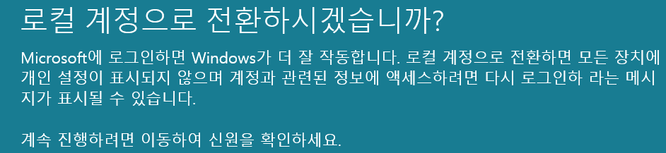 만약 마이크로소프트 계정 로그인이 불안하다라고 하신다면, 로컬 계정으로 쓰시되 마이크로소프트 계정 로그인할 때 이중 인증이 가능한 Microsoft Authenticator(사용방법 둘러보기)를 사용하시면 안전한 사용이 가능합니다.