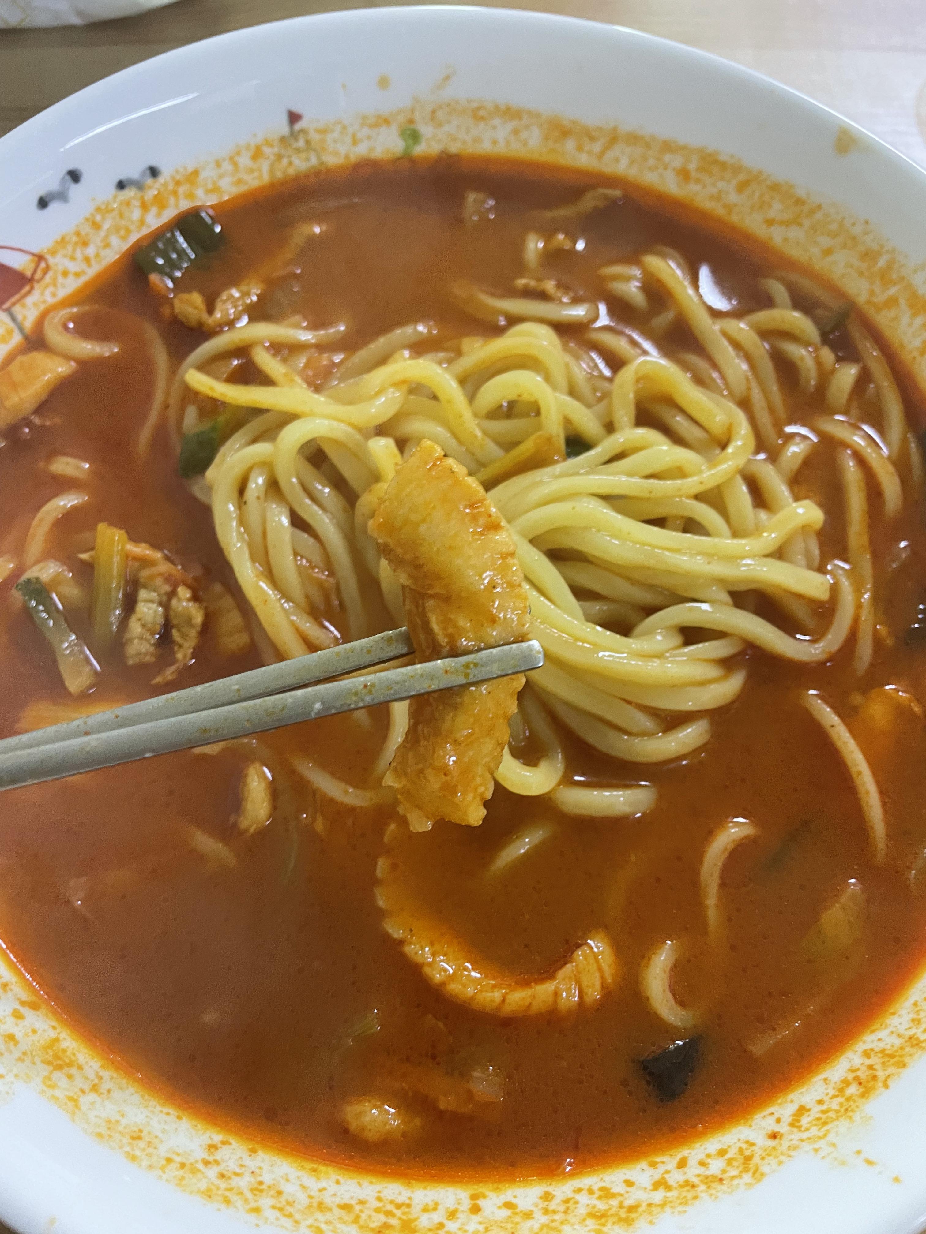 불닭x음면 같은 입에서 맴도는 매운 맛이라기 보다는, 마치 마라탕 같은 얼얼한 매운 맛 쪽에 더 가깝지만, 매울 신 한자가 써있는 그 라면 대비 최소 2배 이상은 매운 것 같습니다. 제가 매운 음식을 못먹는 편이 아닌데, 이연복 목란 짬뽕은 맵습니다.