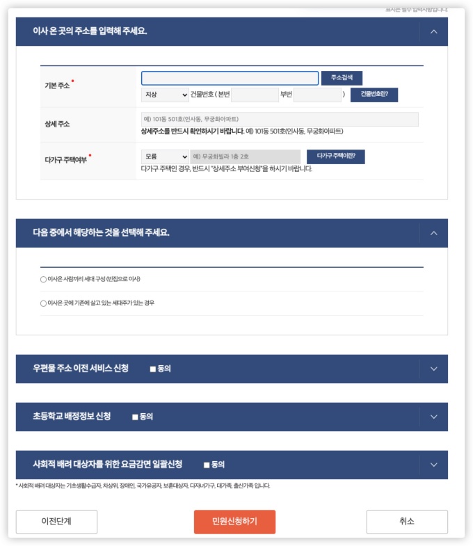 새로 이사온 곳의 주소와 다가구 주택여부, 세대 구성 형태 등을 선택하시고, 옵션으로 우편물 주소이전 서비스, 초등하교 배정정보, 공공요금감면 신청까지 전입신고 인터넷 신청 시에 일괄적으로 할 수 있어서 편리합니다.