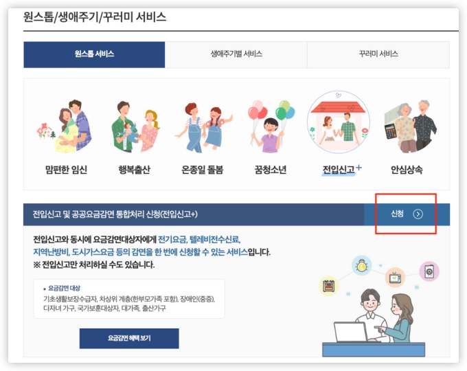 - 3. 전입신고 및 공공요금감면 통합처리 신청에서 "신청" 클릭