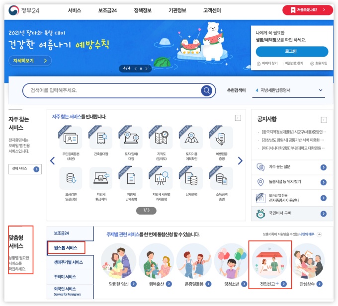 정부24 홈페이지에 들어오시면, 중간 쯤에 '맞춤형 서비스' 항목이 있습니다. 여기서 '원스톱 서비스'를 클릭해 주시면, 오른쪽에 '전입신고+'라는 항목이 보입니다. 여기로 들어가주세요.