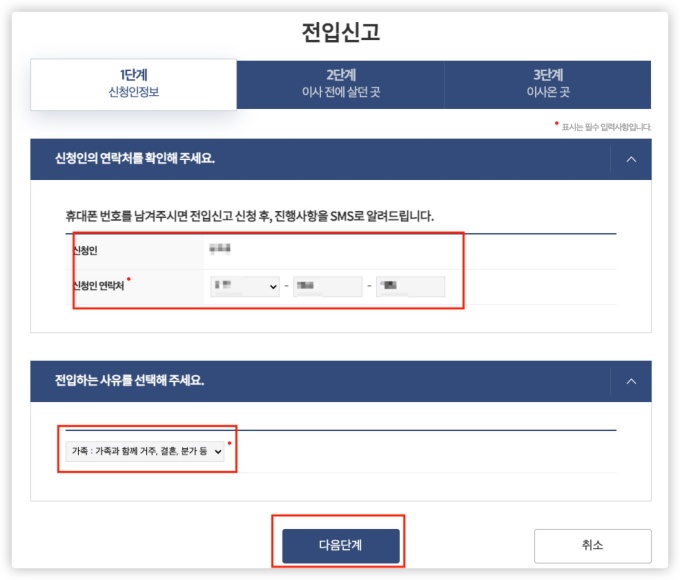 - 5. 신청인 정보 기재 : 연락처, 전입사유