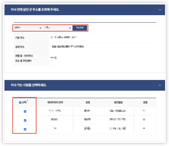 그리고 이사 가는 사람이 세대주 포함 세대원 전체인지, (결혼 후 분가, 독립 시) 세대원 일부인지 실제 이사하는 인원을 선택하시고 다음 단계로 넘어가시면 됩니다.