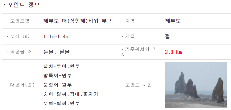 적정 물 때와 가장 중요한 낚시 대상어종 등의 정보가 포인트별로 잘 정리되어 있습니다.