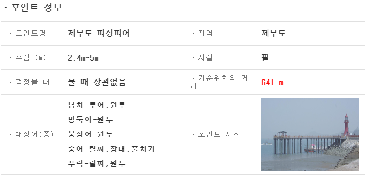 뿐만 아니라, 각 낚시포인트별 수심과 적정 물 때, 그리고 핵심 정보 중 하나라 할 수 있는 대상어종까지 소개가 되어 있어서 매우 유용합니다.