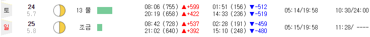 이번엔 6월 마지막주 제부도 물때 시간표를 확인해 보겠습니다. 6월 25일 일요일 제부도 물때 시간표를 보면, 새벽 2시 30분경 물이 완전히 빠져나간 만조시각이며, 이후 물이 다시 들어오면서 아침 8시 42분에는 물이 완전히 가득 들어오게 됩니다. 이후 다시 물이 빠지면서 오후 2시 28분에는 다시 바닥을 드러내며, 이 시각 이후 점차 물이 들어오면서 밤 9시 2분에는 다시 물이 가득 차게 됩니다.