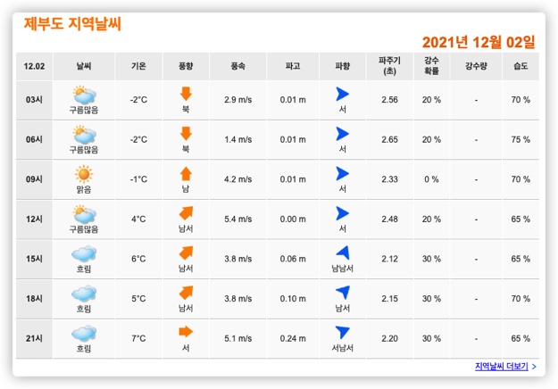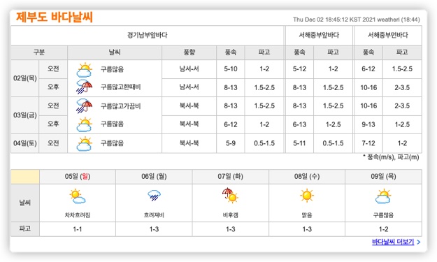제부도 지역 날씨를 열어보시면, 해당 날짜의 3시간 단위 날씨와 기온, 풍향과 풍속, 그리고 파고와 강수량까지 아우르는 모든 지역 날씨 정보를 한눈에 파악하실 수 있습니다. 또한, 바다 날씨도 별도로 있어서 낚시를 하고자 하시는 분들에게 선별된 정보를 제공해 주고 있습니다.