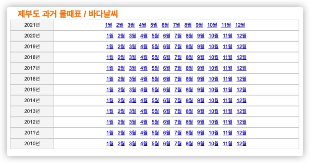 뿐만 아니라, 제부도 물때표 아래에 보시면 제부도 과거 물때표라고 해서 지난 10여 년 간 월별 물때표도 확인할 수 있게 해 놓았네요.