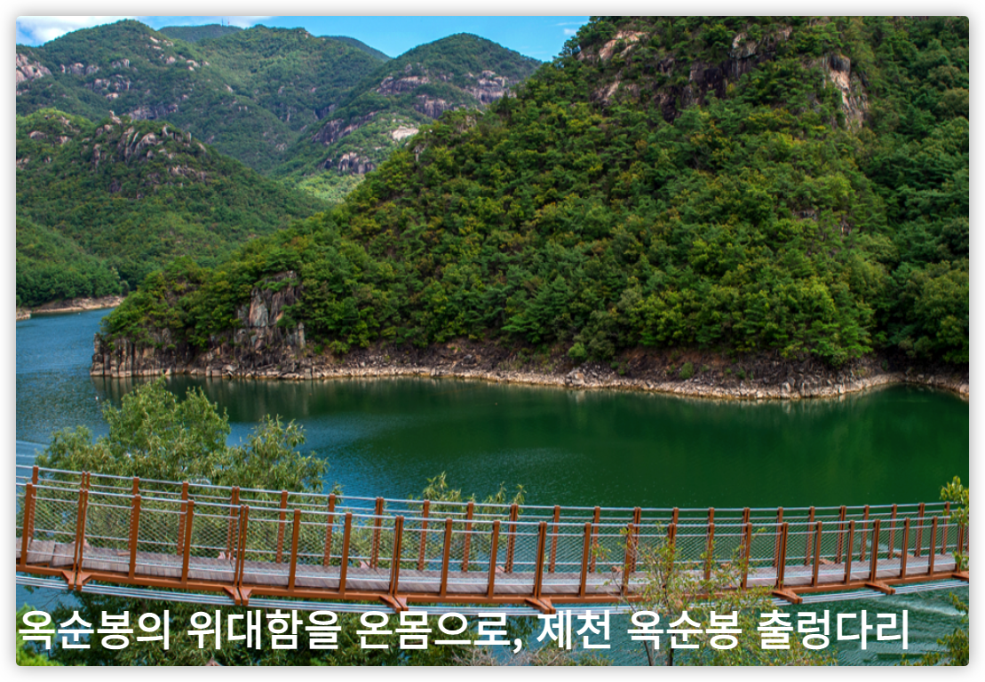 가장 먼저, 제천의 명소 옥순봉의 경관을 한가운데서 만끽할 수 있는 옥순봉 출렁다리가 있습니다.