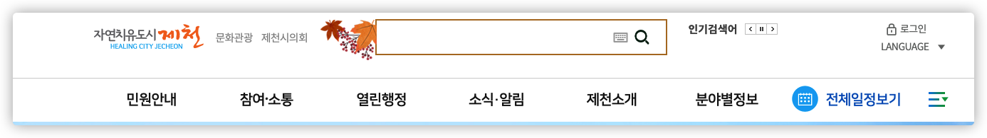 제천시청 공식 홈페이지를 들어가시면, 상단에 다양한 메뉴들이 있는 걸 확인하실 수 있습니다. 지자체 홈페이지의 메인인 민원 안내와 시민 참여 및 소통이 가능한 참여 소통, 행정안내와 소식 알림, 그리고 제천 소개 등 여러 가지 정보가 있습니다.