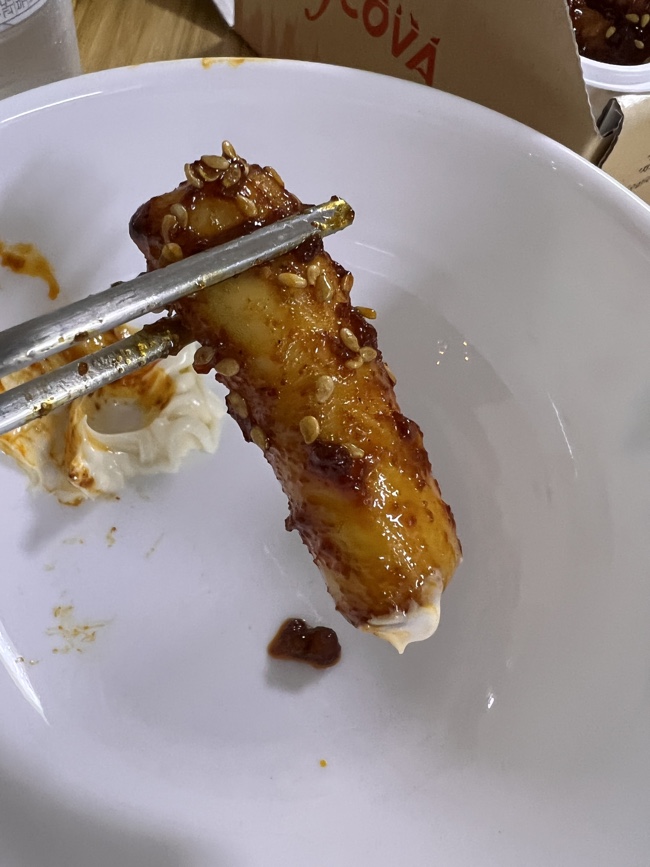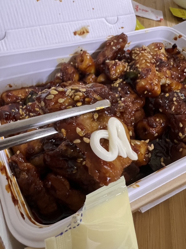 오.. 이 조합 너무 맛있습니다. 지코바 치킨 양념의 얼얼한 매운맛을 마요네즈가 적당히 잘 잡아주네요. 마치 60계치킨 고추치킨과 마요네즈 조합 같은 느낌입니다.