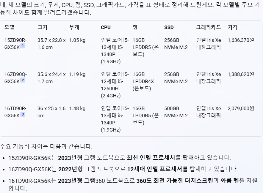 다시 빙챗으로 돌아와서, 제가 사용하고 있는 노트북인 LG 그램의 세 가지 라인업 (2023 그램 16ZD90R-GX56K, 그램 스타일, 그램 울트라슬림(출시예정, 디자인 살펴보기<<))에 대해 비교해달라고 시켜보았습니다. 각각 챗GPT와 빙챗에 시켰는데요.