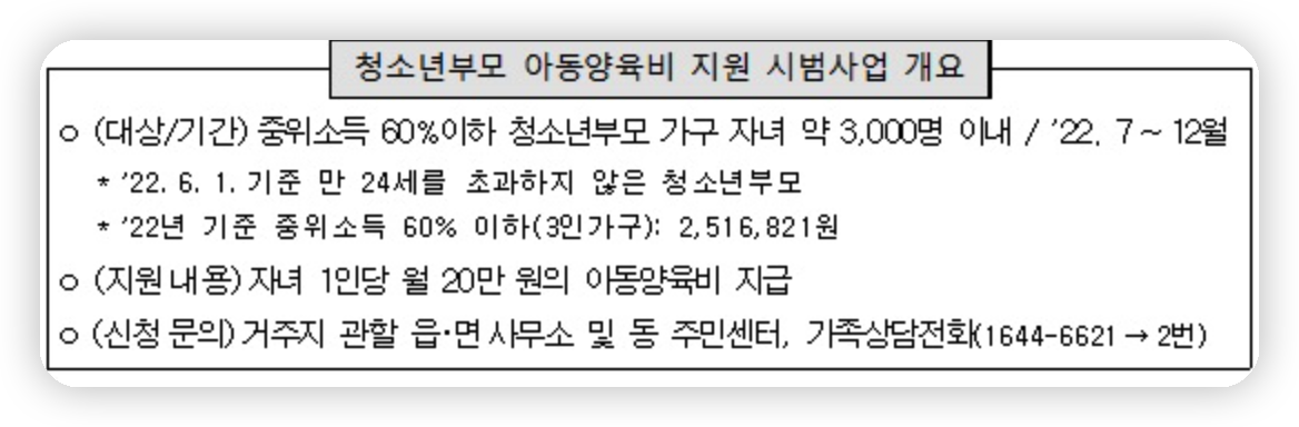 정부가 만 24세 이하의 청소년 부모 가구에 자녀 1명 당 한 달에 20만원의 아동 양육비를 신규 지원하는 사업을 진행합니다. 이러한 청소년 부모 아동 양육비 사업은, 쉽지 않은 환경에서도 자녀를 양육하는 청소년 부모 가정에 힘을 주고자 하는 취지입니다. 이 청소년 부모 아동 양육비 지원 기준과 대상, 신청 방법은 어떻게 되는지 알아보겠습니다.