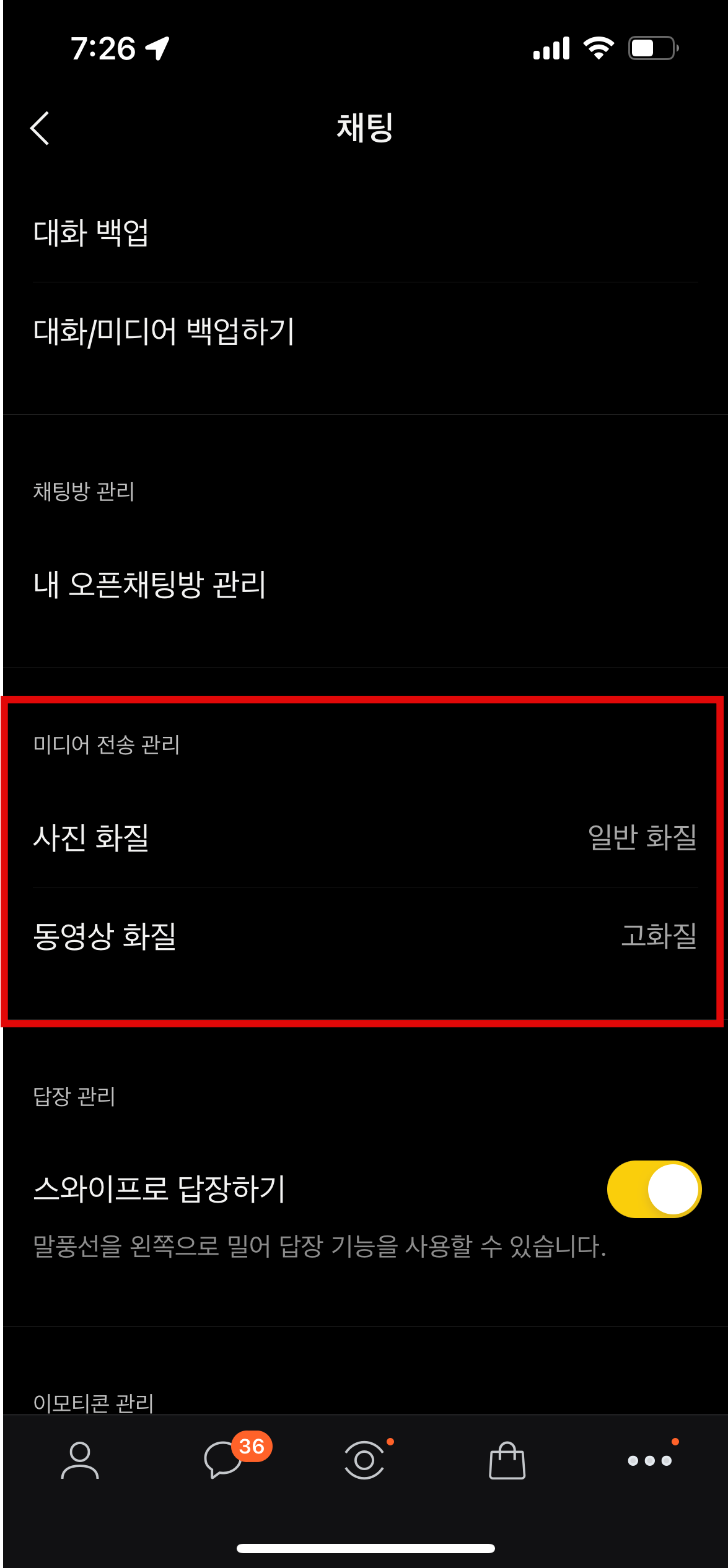 채팅 메뉴에 들어오시면, 중앙에 사진 화질과 동영상 화질이 있습니다.