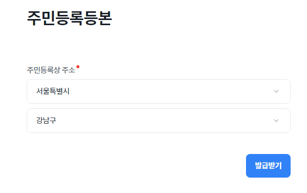 주민등록등본을 누르면, 주민등록 상 주소를 시군구 정보까지만 넣으면 됩니다. 물론 여기까지는 민원 24 주민등록등본 인터넷 발급방법과 유사합니다만, 메뉴가 간소한 만큼 확실히 찾기가 더 편한 것 같습니다.