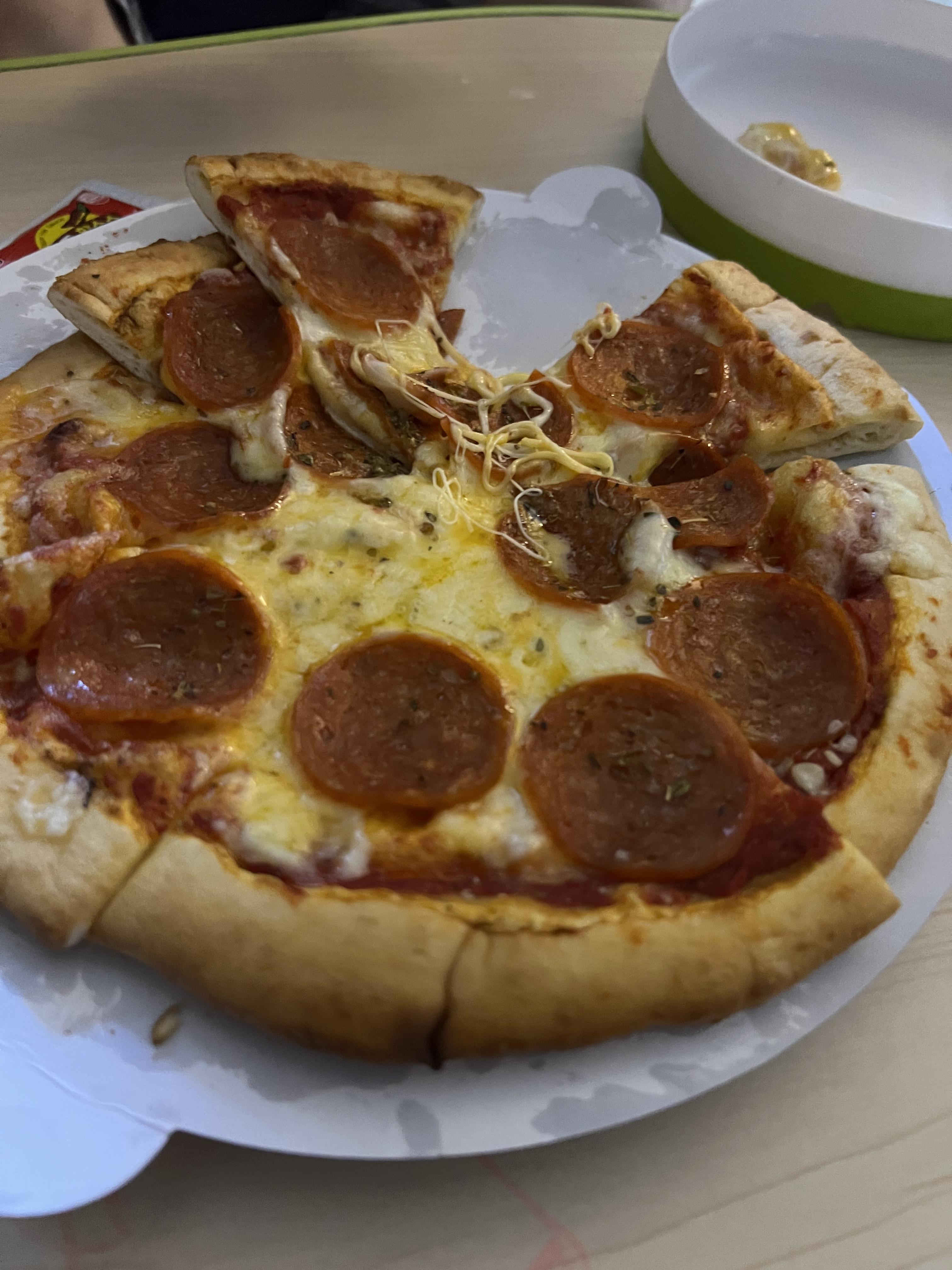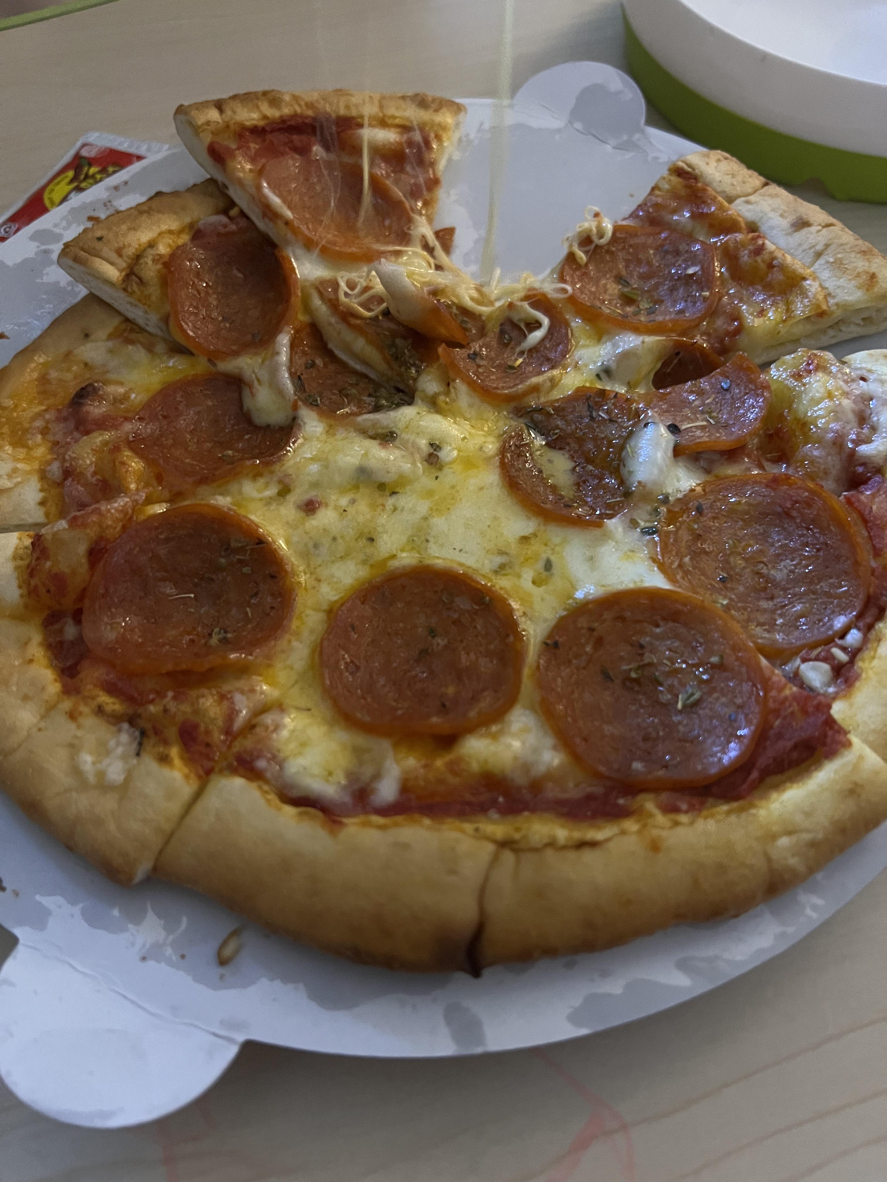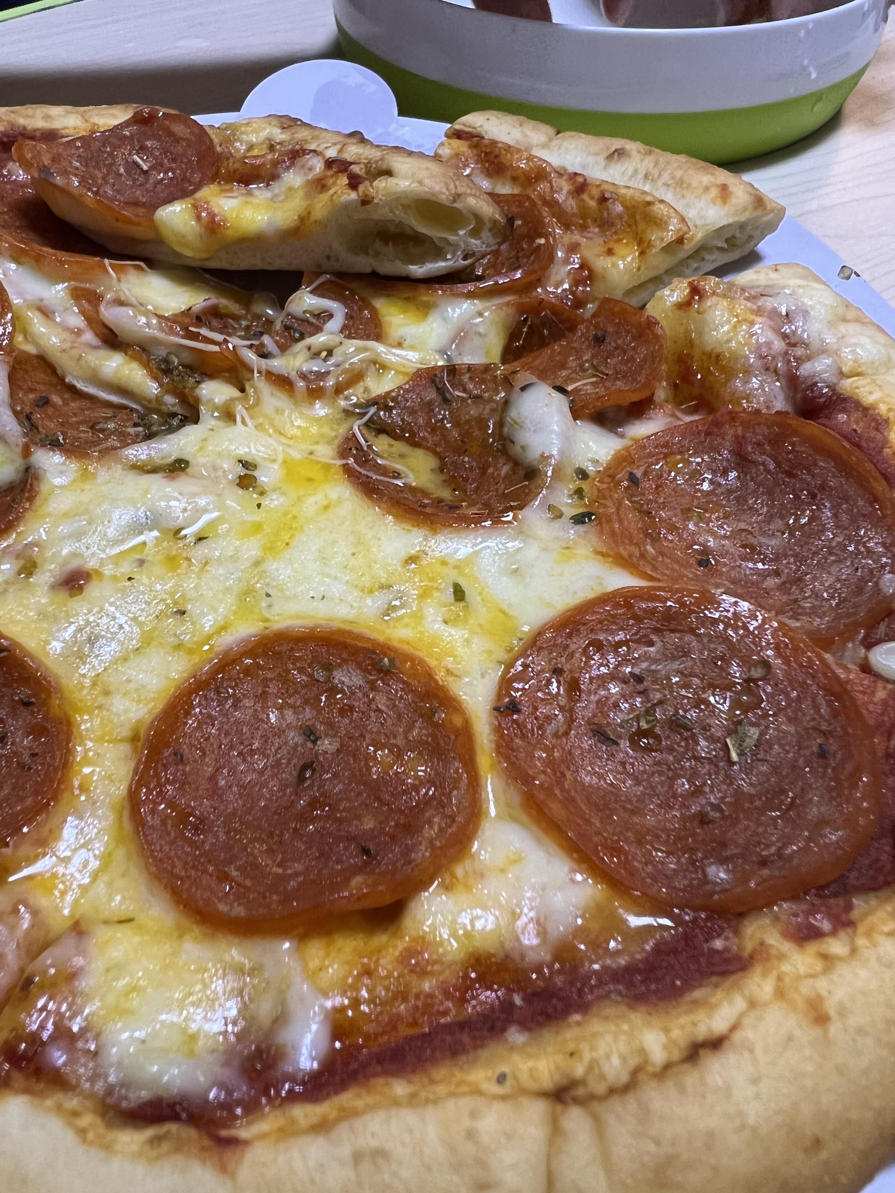 그리고 치즈 아래로 깔린 토마토 소스의 맛도 진하게 났습니다. 딱 '토마토 소스맛, 치즈맛, 페퍼로니맛' 이렇게 납니다. 제가 원하는 전형적인 페퍼로니 피자 맛이었습니다.