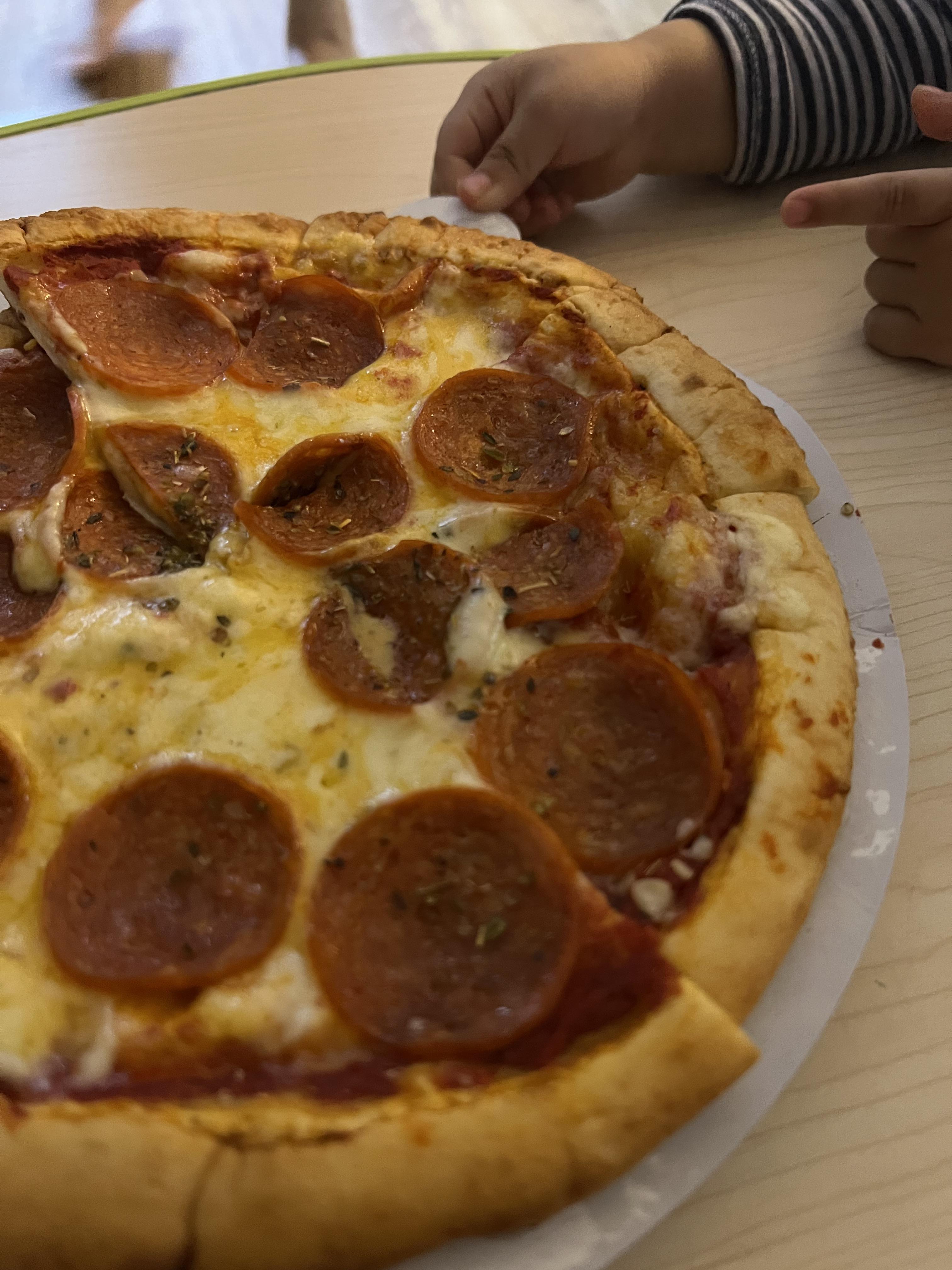 저희 아이가 피자의 고소한 냄새를 참지 못하고 벌써 손을 뻗고 있습니다.