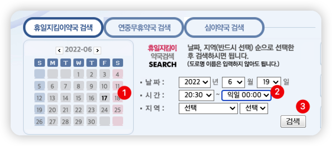 - 2. 시간 : 방문하고자 하는 시간대를 선택합니다. (표기되어 있는 시간은 휴일지킴이약국 영업시간입니다.)