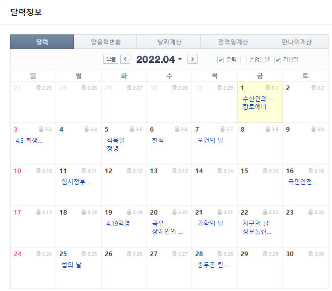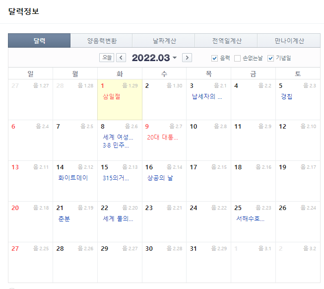 - 2022년 공휴일 3월 : 3/1(화, 삼일절), 3/9(수, 대통령선거일)
