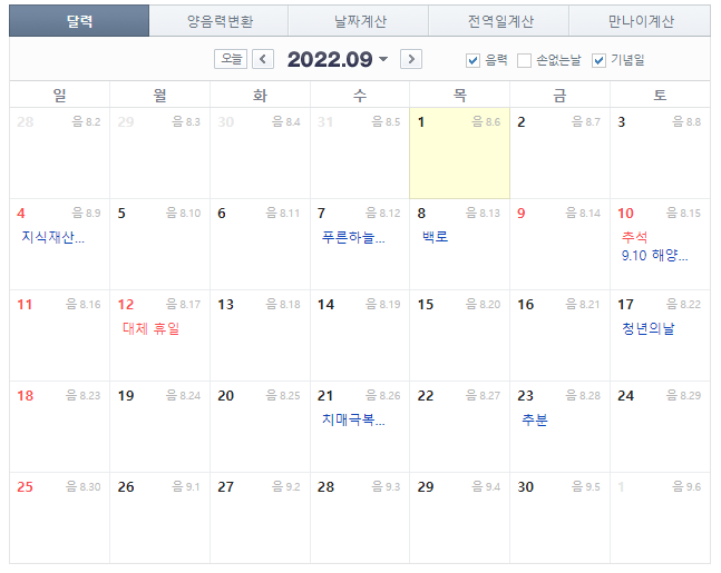 - 2022년 9월 공휴일 : 9/9(금)~9/11(일, 추석 연휴), 9/12(월, 대체휴일)