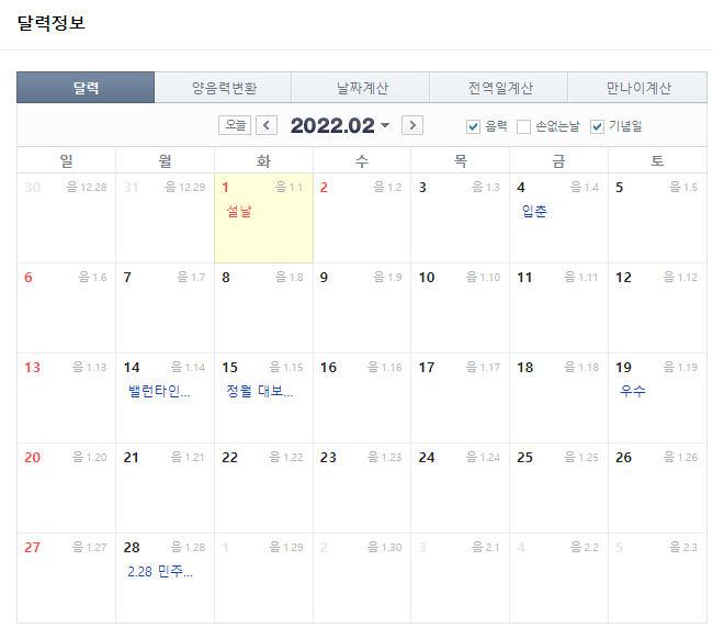 2022년 2월 달력을 보겠습니다. 1월 31일부터 이어진 설 연휴가 2월 2일까지 있네요. 2월 1일이 2022년 설날입니다.