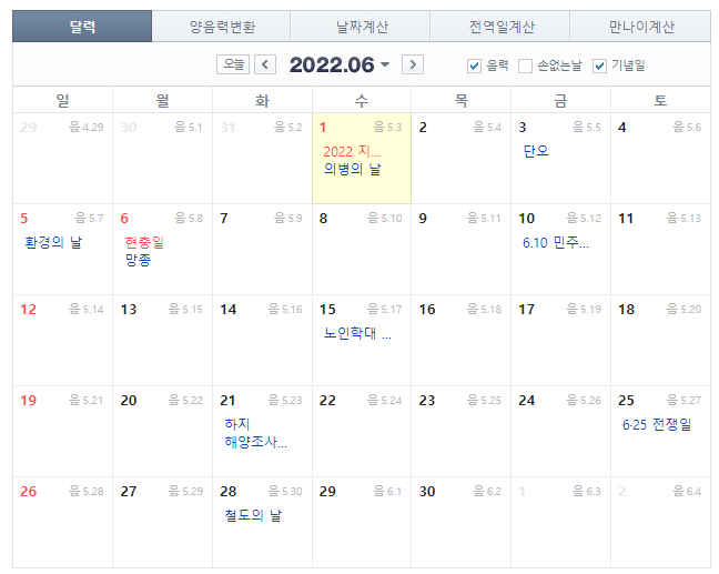 - 2022년 6월 공휴일 : 6/1(수, 지방선거일), 6/6(월, 현충일)