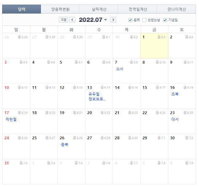 7월로 가보겠습니다. 7월에는 제헌절이 눈에 띄지만, 제헌절은 이제 공휴일이 아니기 때문에 별도의 공휴일은 2022년 7월엔 없습니다.