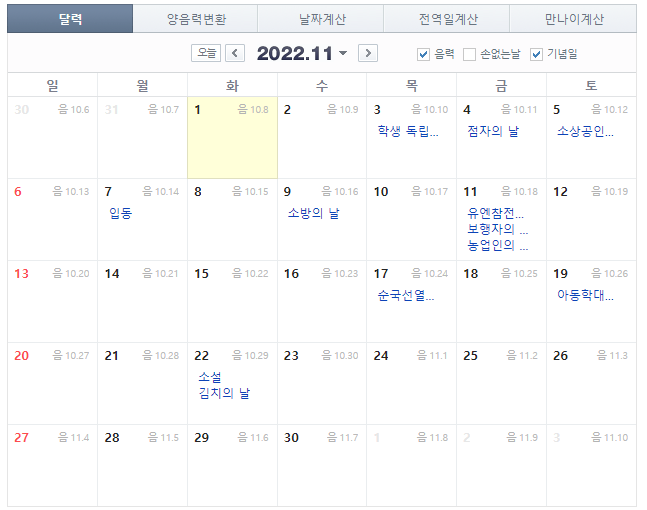 다음은 11월입니다. 앞서 말씀드렸다시피, 매년 4월과 11월이 휴일이 가장 적은 달입니다. 2022년 11월 달력을 살펴보니 역시나 공휴일은 단 하루도 없습니다.