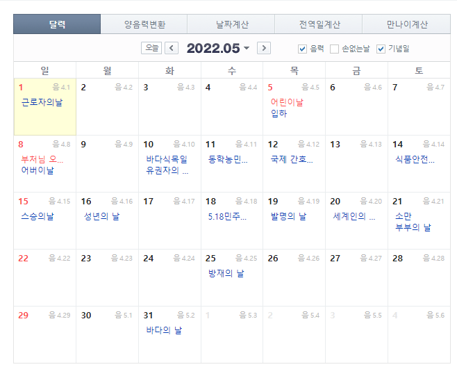 5월은 가정의 달이죠. 2022년 5월 달력을 살펴보니, 5월 1일 근로자의 날이 일요일입니다. 이 날은 모든 일터가 쉬는 공휴일은 아니고, 일반 근로자들 위주로 쉬는 날이기 때문에 일반 직장에 다니시는 분들은 매우 아쉬울 수 있습니다.