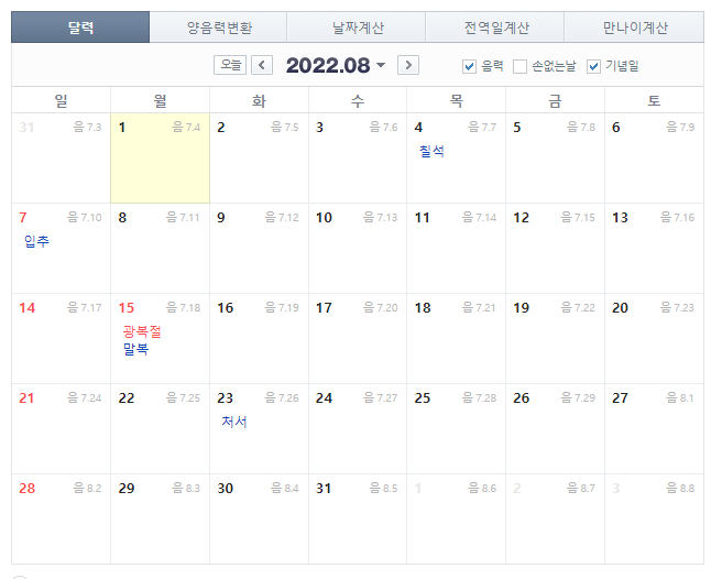 - 2022년 8월 공휴일 : 8/15(월, 광복절)