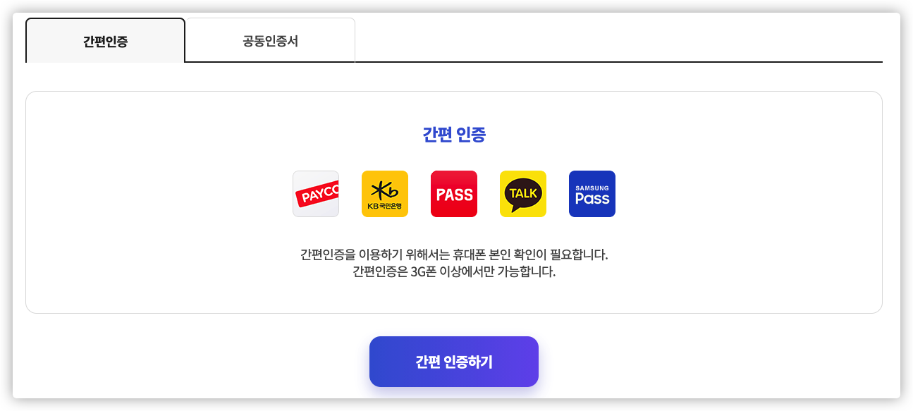 신청하기 버튼을 누르면, 로그인 화면이 뜨는데요, 위에 보시면 간편인증 탭과 공동인증 탭이 있습니다.