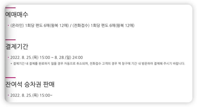 SRT 예매 매수 역시 KTX와 동일하게 1인 편도 6매(왕복 12매) 한도이며, 발권 기간은 8월 25일 15시부터 8월 28일 밤 12시까지입니다.
