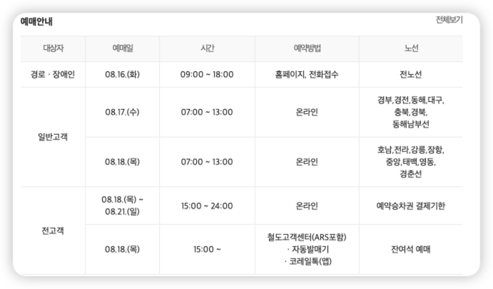 예매 둘째날인 8월 24일 수요일에는 오전 7시부터 오후 1시까지 PC나 모바일 홈페이지를 통해 경부선만 예매가 가능합니다.