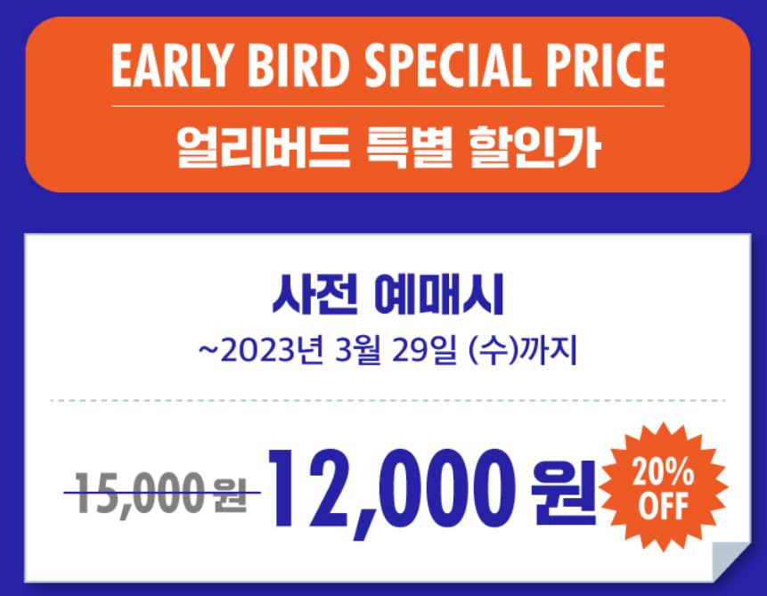 하지만 보셨다시피 2023 서울모빌리티쇼 입장권 얼리버드 구매 가능기간은 2월 15일부터 3월 29일까지입니다. 정식 관람이 시작되는 3월 30일부터는 얼리버드 할인 혜택은 종료됩니다.