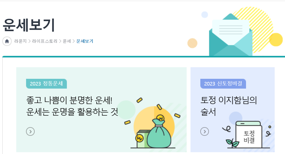 운세 사주 항목에 들어오시면, 한 달간 나의 재물운과 애정운, 건강운 등은 어떤지 알 수 있는 월간 종합운세부터 평생운세, 2023 신토정비결 등을 한눈에 쉽게 찾아볼 수 있습니다.
