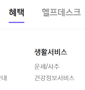 여기서 혜택 탭을 보시면, 생활서비스 항목에 운세/사주 항목이 있습니다.