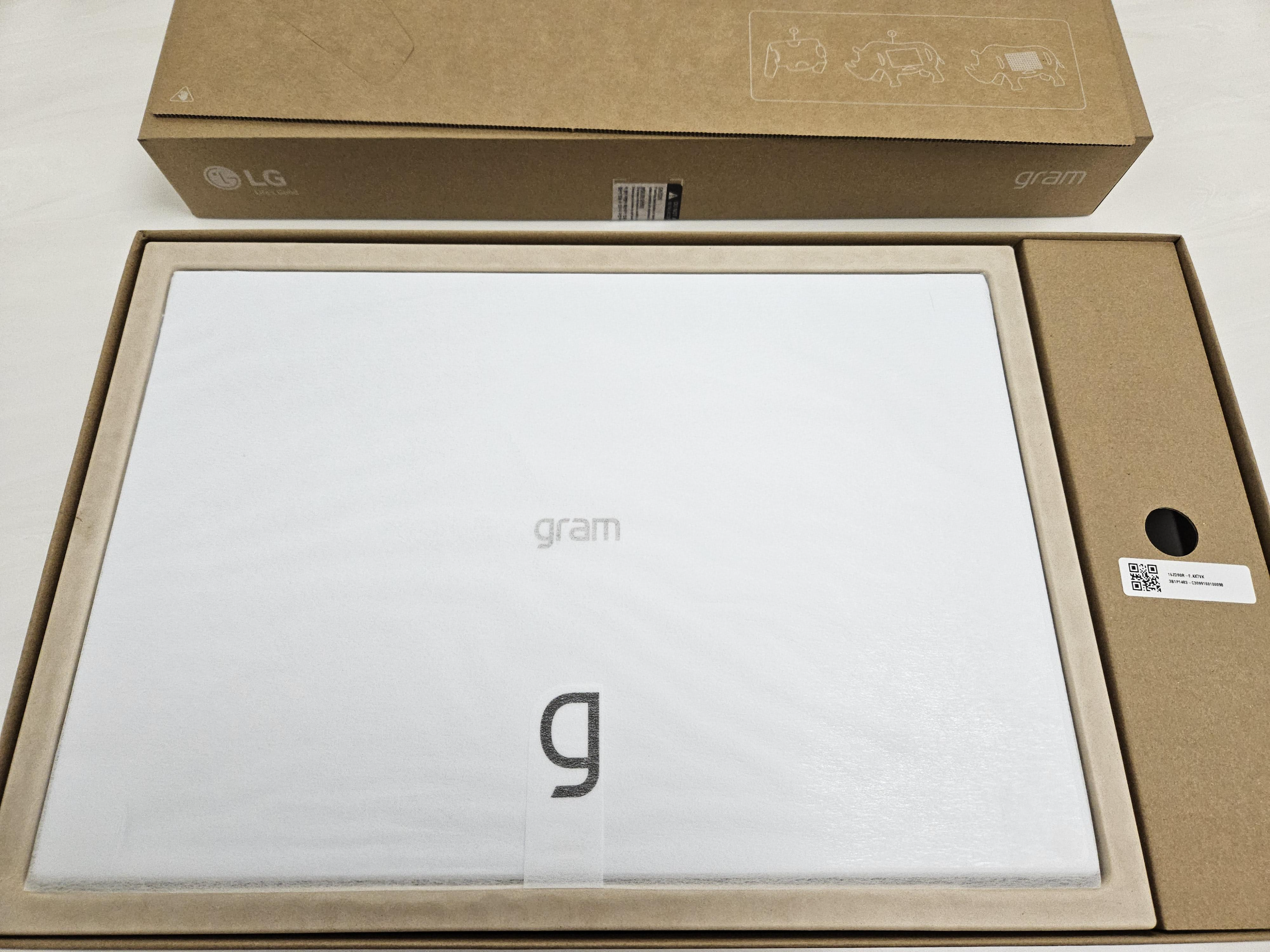 박스를 열면, 2023 lg 그램 16인치가 모습을 드러냅니다. 기존 2022 그램과 크게 다를 것 없는 디자인이기 때문에 특별히 새로운 감흥이 밀려오거나 하지는 않네요.