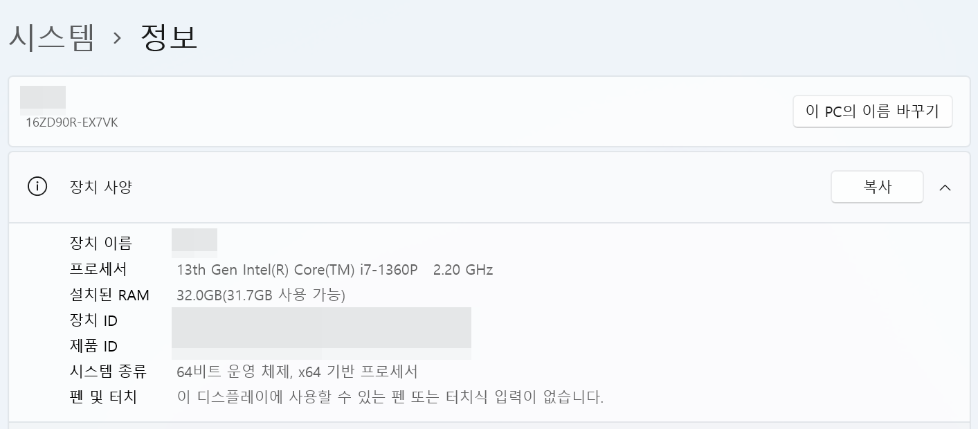 제가 구매한 모델은 16ZD90R-EX7VK 입니다. 사양에서 알 수 있듯 Core i7-1360P, 그리고 6000 mhz의 DDR5 32GB 램인데요, 이 화면만 보아도 일단 수치에서 오는 만족감이 대단히 높습니다. 램 31.7GB 사용가능... 램에 한 맺히면 이렇게 됩니다.
