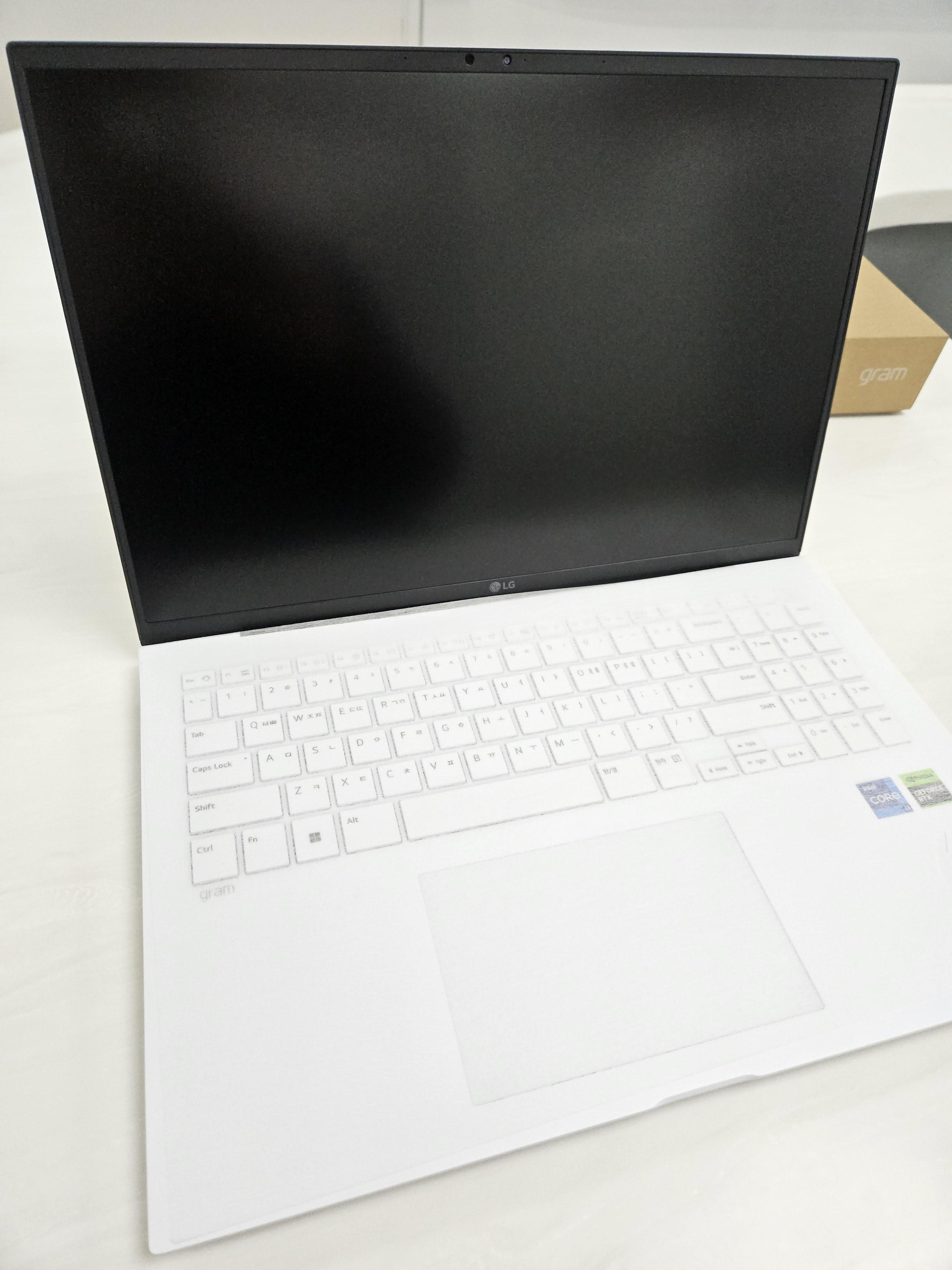 lg 그램의 상징이라 할 수 있는 순백의 화이트 바디의 그램입니다. 상하판 모두 무광 재질로 되어 있으며, 보시는 사진은 처음 상판에 붙어있는 보호필름 때문에 유광처럼 보입니다.