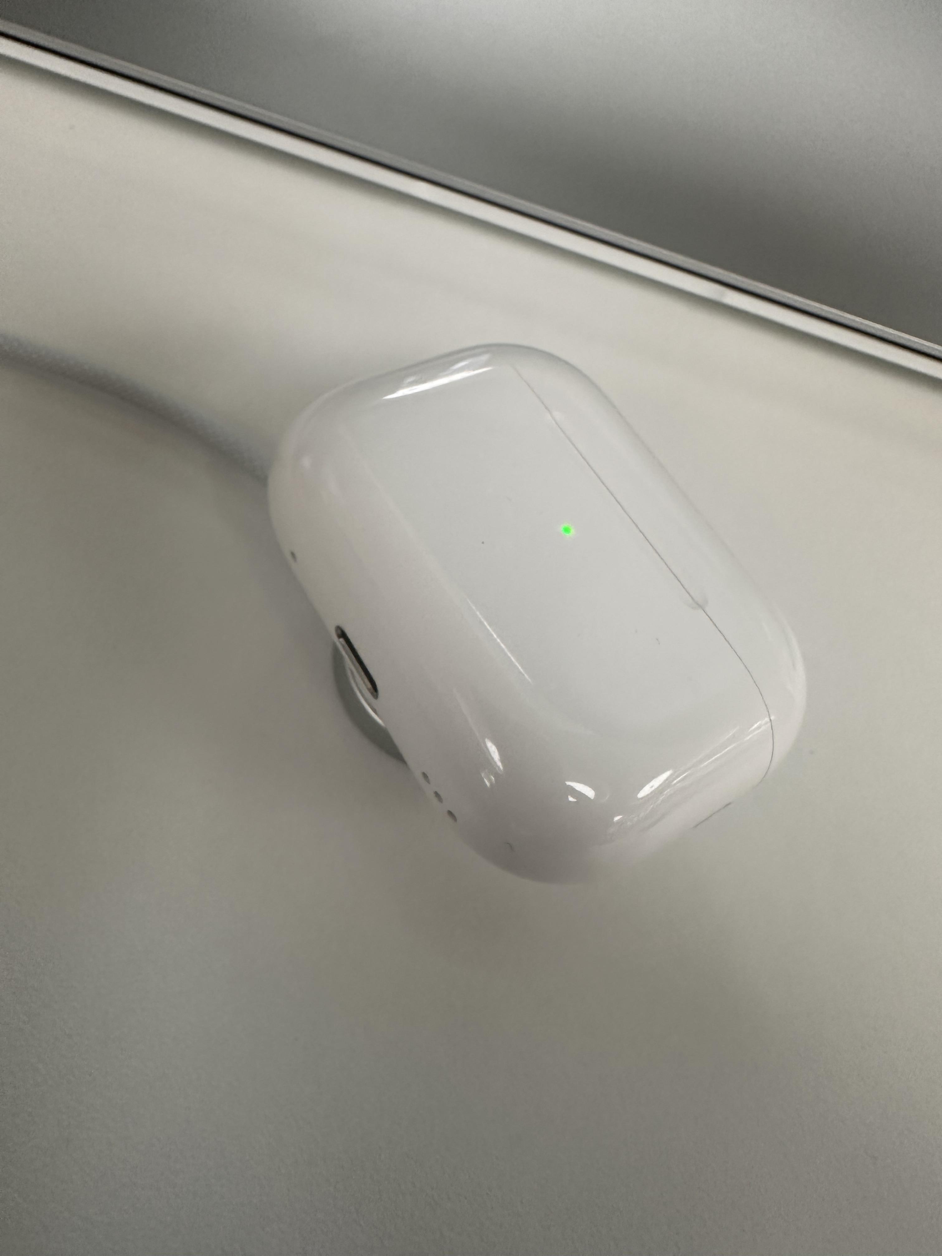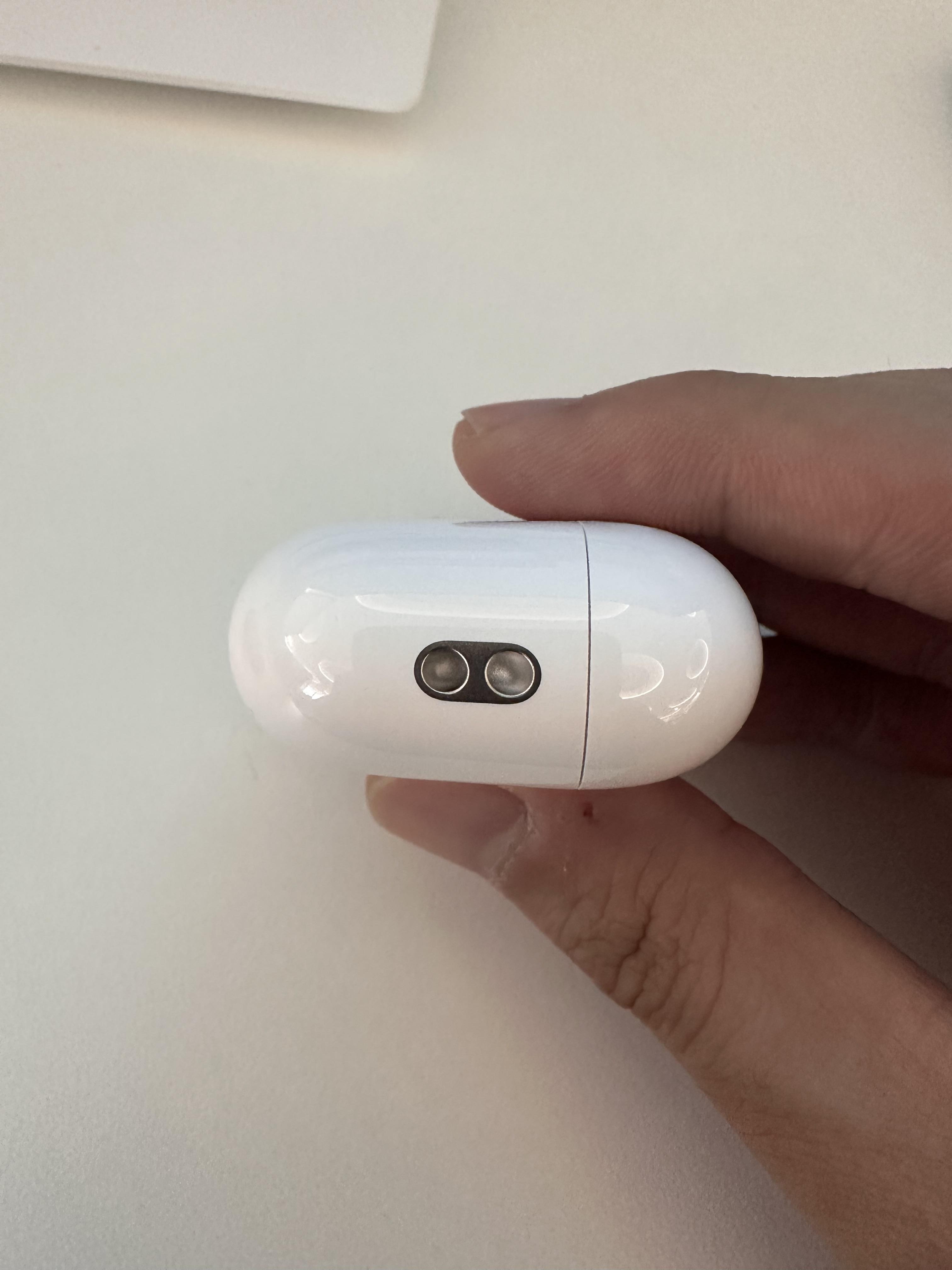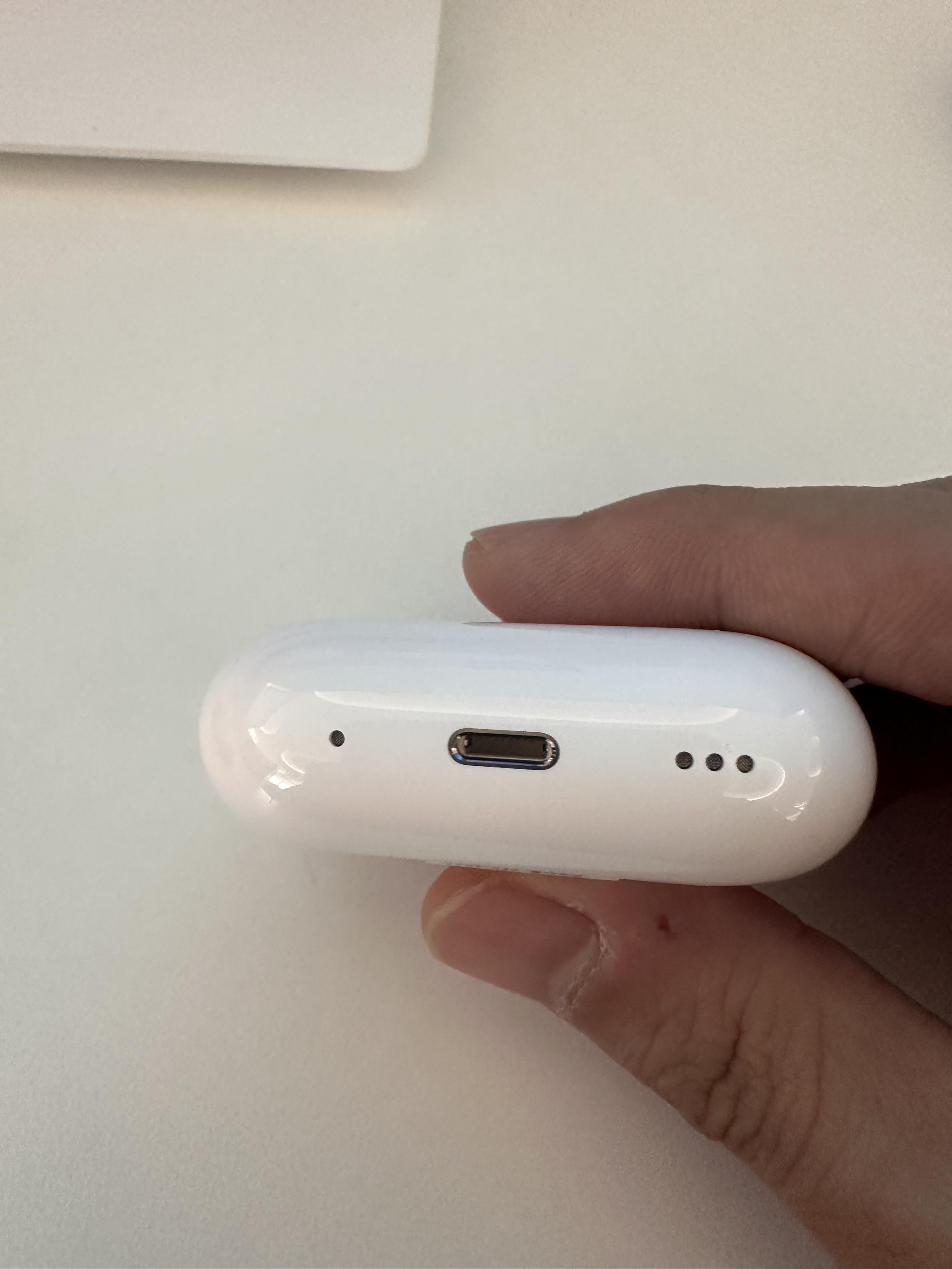 에어팟 프로 2세대 외관의 경우, 기존 1세대와 다소간에 차이가 있습니다. 전면에 led 인디케이터 모습은 동일하나, 아래쪽에 있는 라이트닝 포트 옆으로 스피커 홀이 생겼습니다. 이는 나의 에어팟 찾기 할 때 또는 충전 시 귀여운 사운드를 내주는 용도입니다.