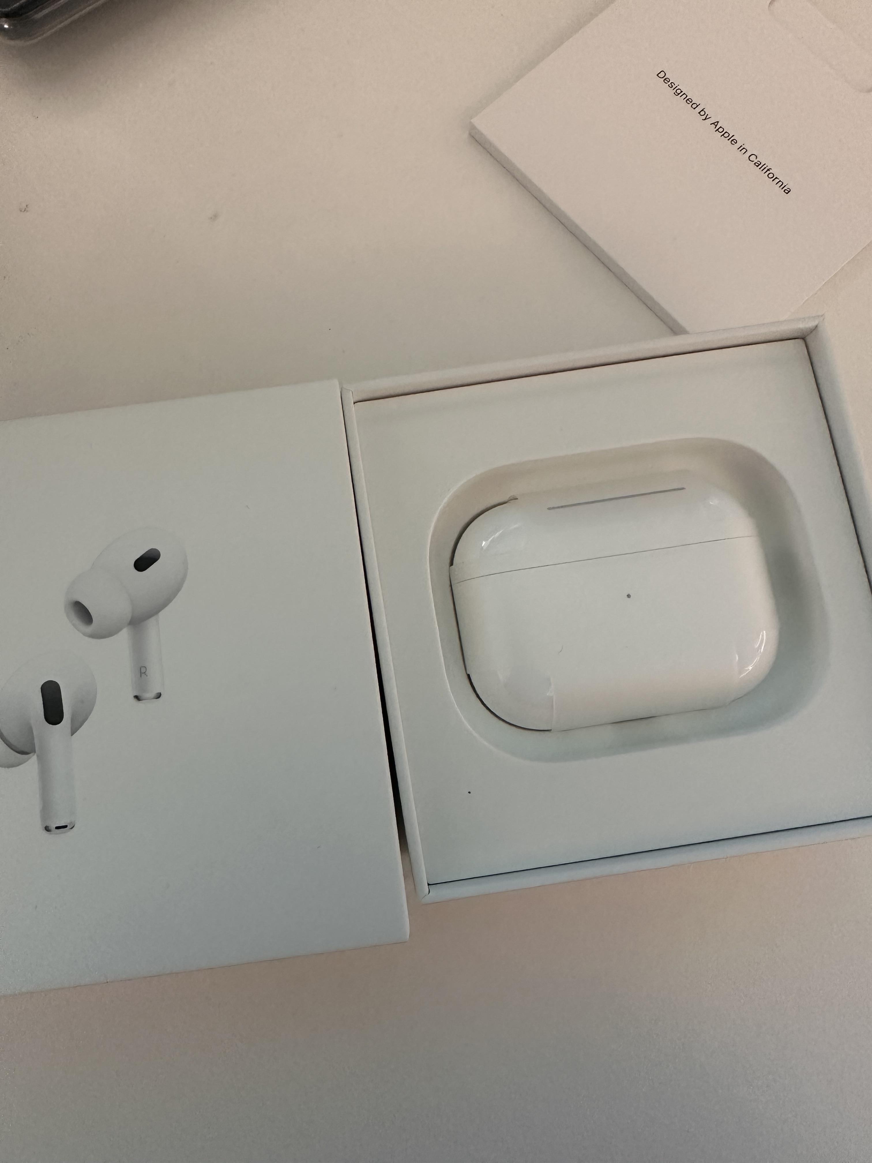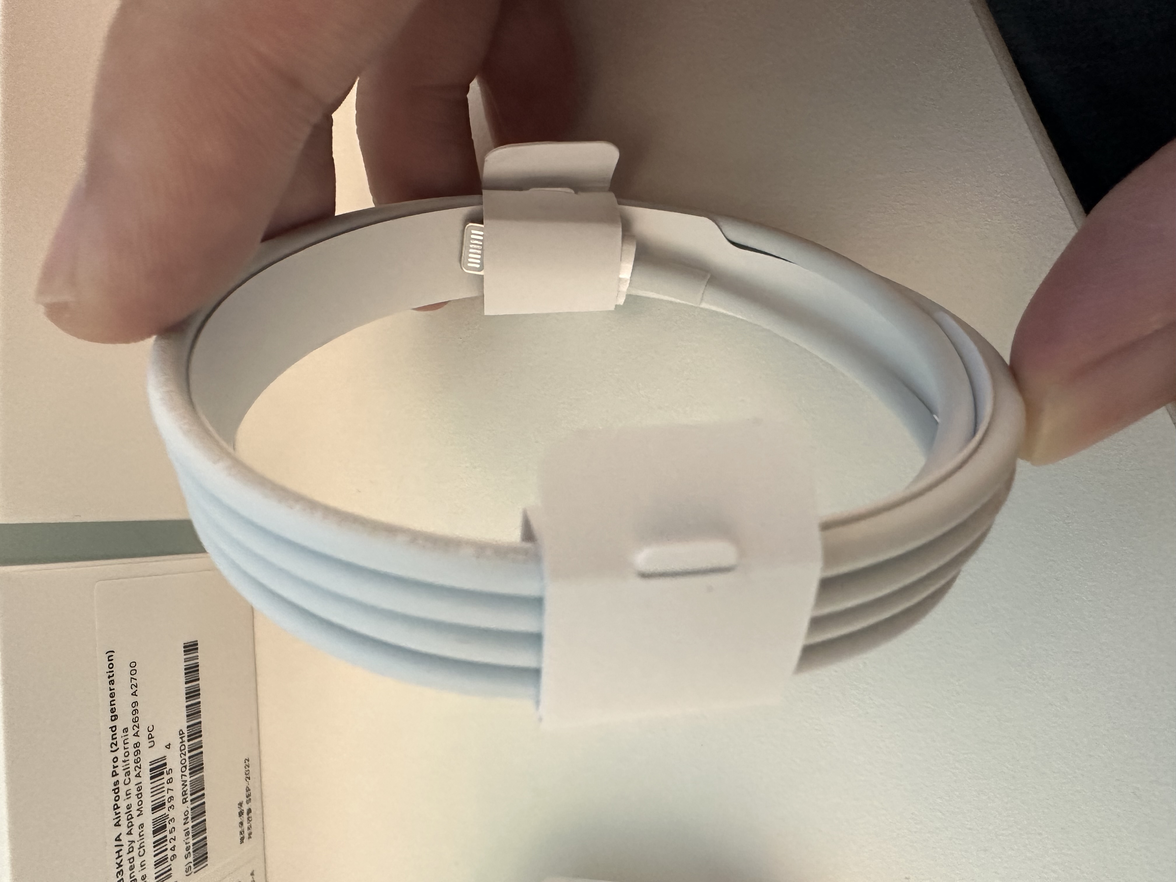 박스를 열면, designed by apple in california가 반겨줍니다. 설명서를 들면 기존 에어팟 프로 패키징과 마찬가지로 본체가 들어있고, 그 아래에 c to 라이트닝(..) 케이블이 들어있습니다. 이번 에어팟 프로 2세대 케이블은 패브릭이 아닌 이전과 같은 선재의 케이블이네요.