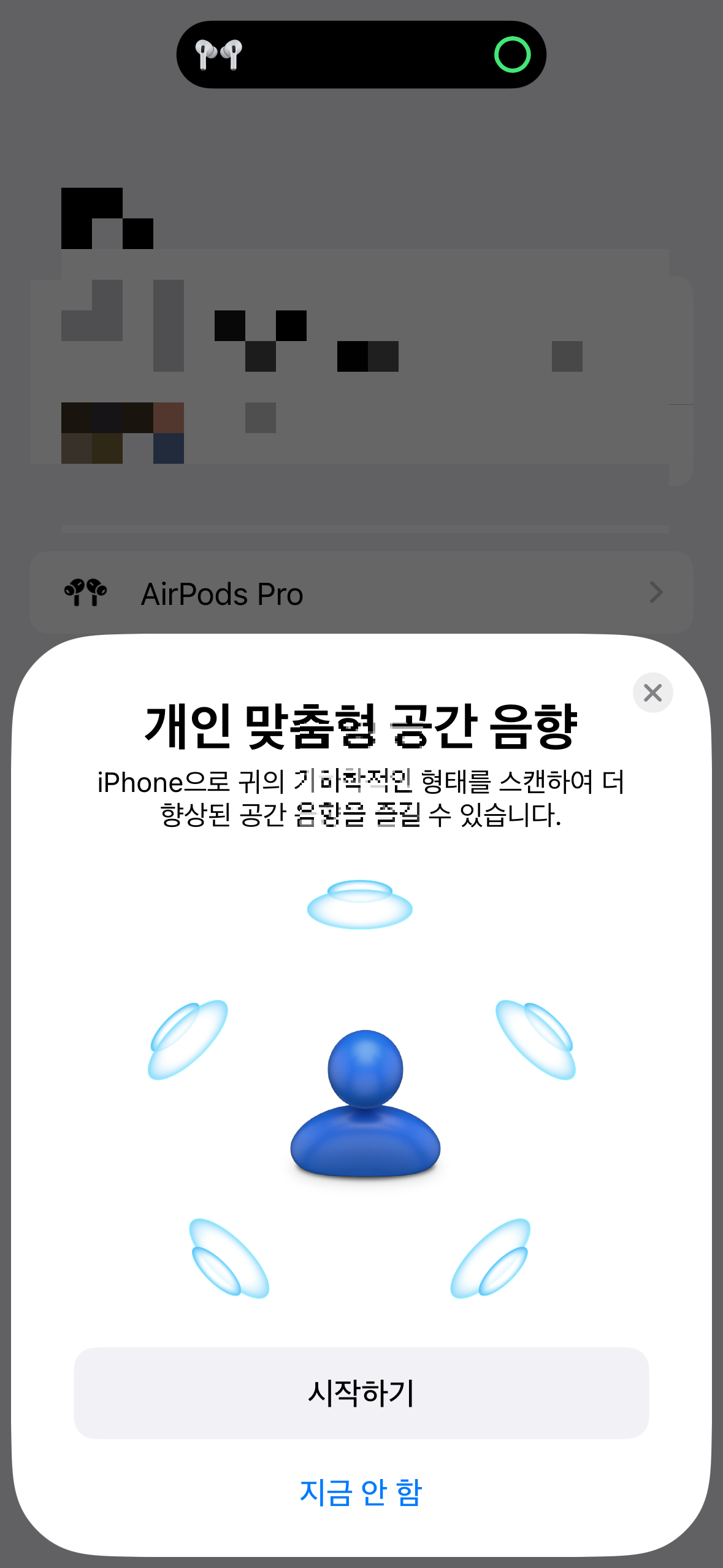 에어팟 프로 2세대 연결을 진행하다 보면, 이렇게 개인 맞춤형 공간 음향 설정을 할 것인지를 묻는 팝업이 뜹니다. 개인 맞춤형 공간 음향(애플 공식 설명 살펴보기👈)은 말로 설명하기 어려울 정도로 신기하면서도 만족감을 주는 기능이니 확인해보시고 꼭 사용해 보시는 것을 추천드립니다.
