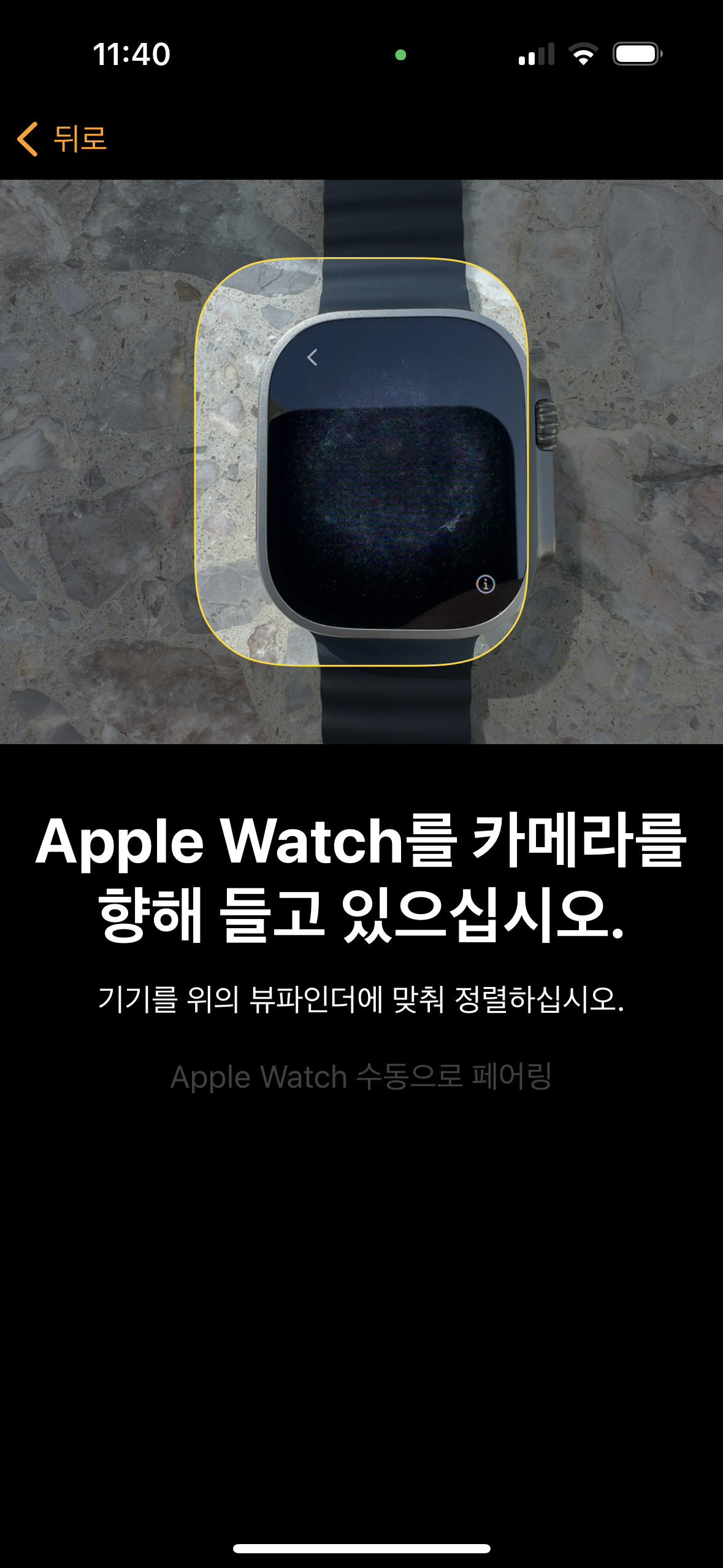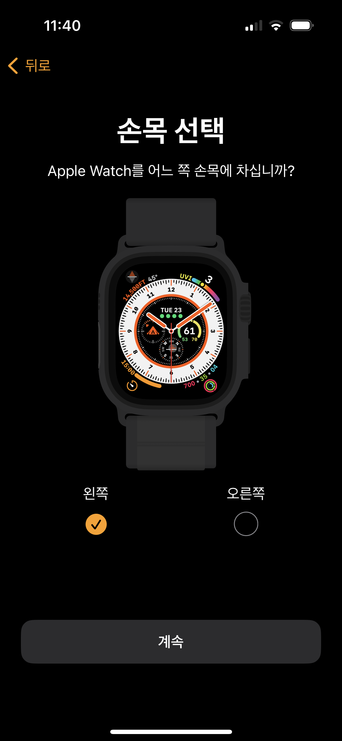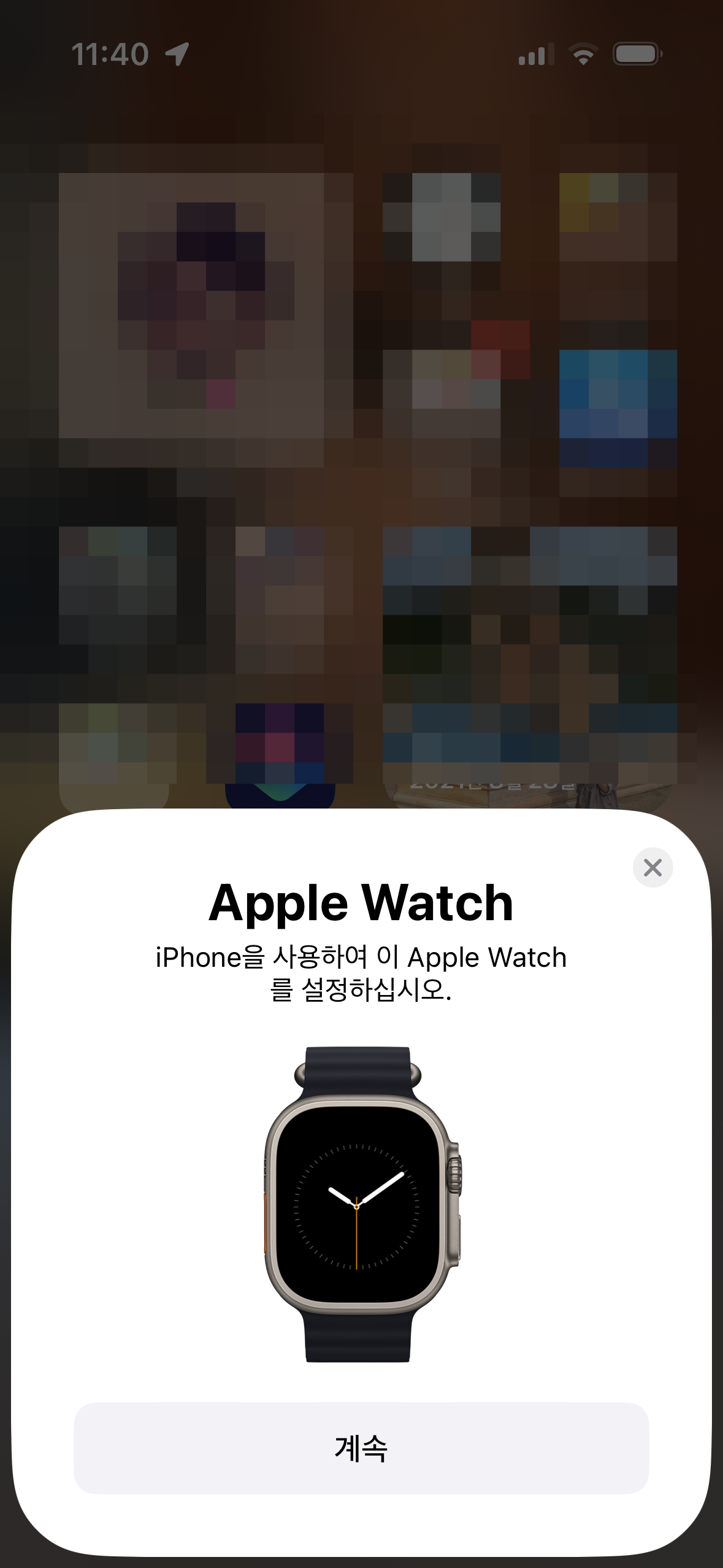 애플워치 전원을 켜고 아이폰을 보고 있으면, 곧 이러한 팝업이 뜨면서 새로 구매한 애플워치 울트라를 인지해서 연결할 것인지 묻습니다. 제가 구매한 애플워치 울트라 오션 밴드 미드나잇 제품이 그대로 뜨네요. 역시 애플 디테일.. 또 한 번 놀랍니다.