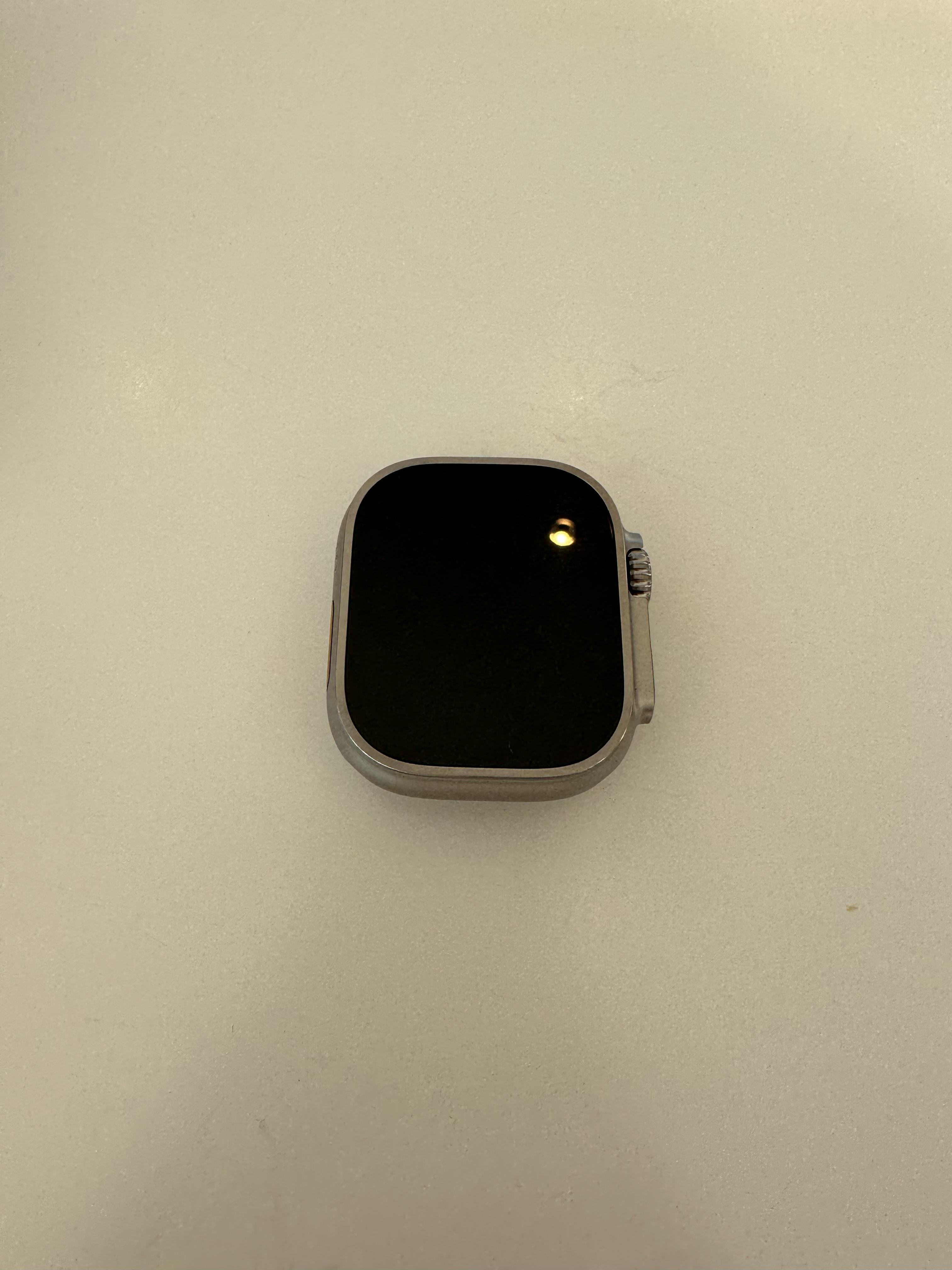 애플워치 울트라 본체입니다. 기존 애플워치 시리즈들과는 다르게, 평평한 플랫형 디스플레이로 되어 있으며 그 주변을 티타늄 소재의 본체가 감싸는 구조로 되어 있습니다. 러기드 한 디자인과 보호력을 동시에 꾀한 모습입니다.